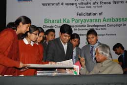 Dr APJ Abdul Kalam, eminent scientist and former President of India, was felicitated by Mr Jairam Ramesh, Minister of State for Environment and Forests as “Bharat Ka Paryavaran Ambassador” on 9 December at New Delhi. Mr Ramesh, while addressing the audience, said his faith in the future of India was reinforced, as by selecting Dr. Kalam, a signal was being sent to the future that Science and Technology can play a very important role in managing the natural environment and growth. He also said that with Dr Kalam as ambassador, environmental awareness would increase since his knowledge on forests and environment is immense.